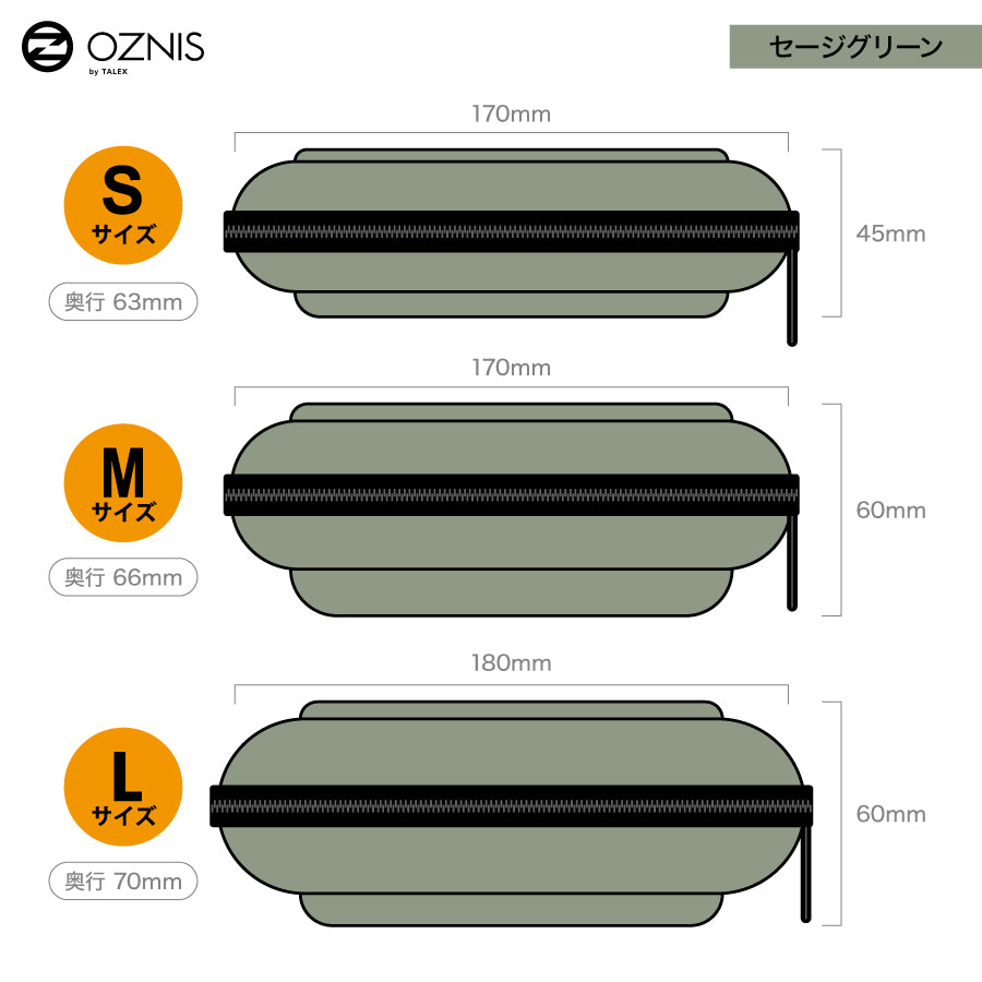 本製品のセージグリーンカラーはOZNISロゴの入ったジッパーの持ち手パーツを採用。(SサイズはFLAT03・04・05専用設計です。)